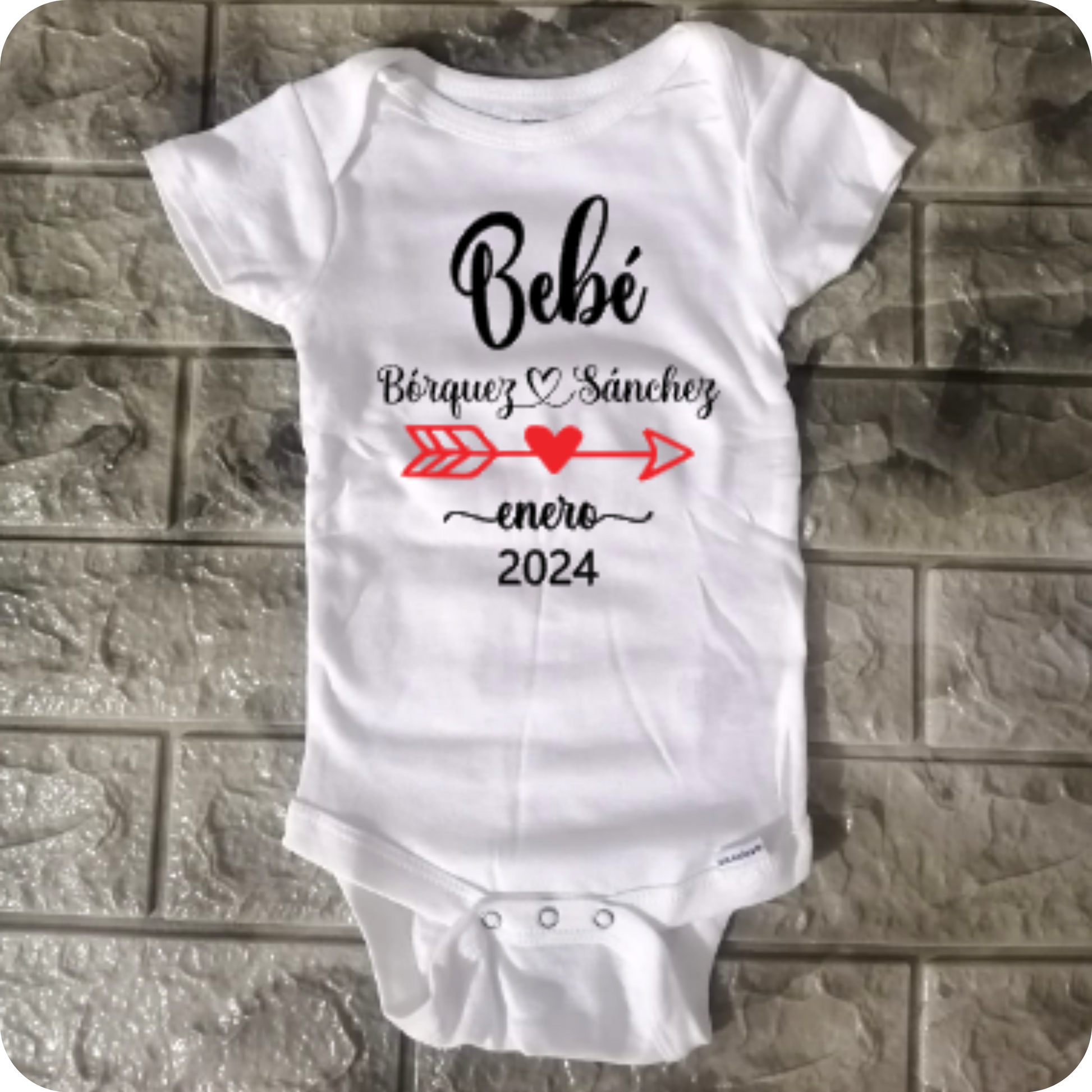 Este modelo incluye los apellidos paterno y materno entrelazados con un corazón que simboliza el amor del cual es fruto el hermoso ser que viene en camino.