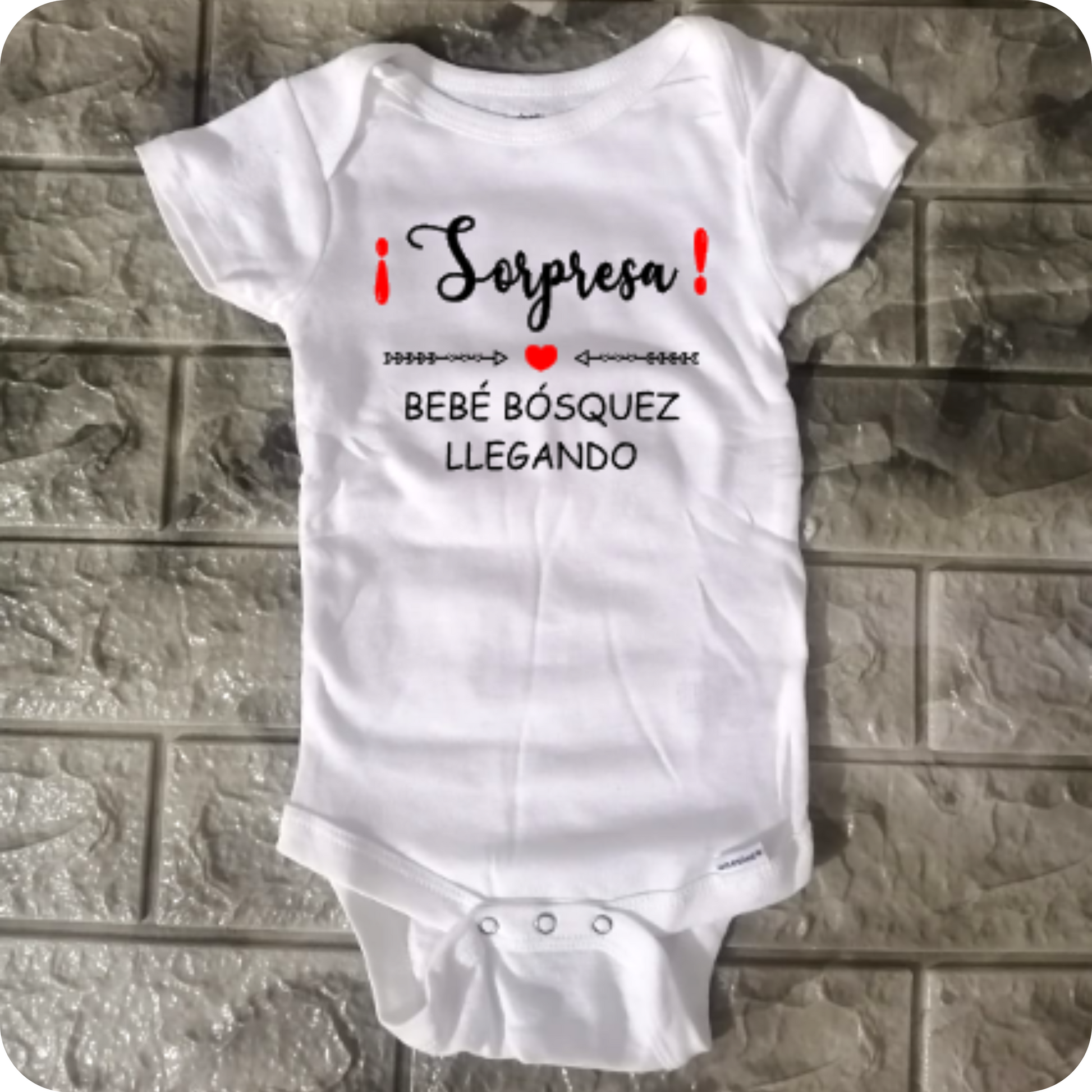 Mameluco de bebé personalizado con el apellido de tu retoño para dar la noticia de tu embarazo.
